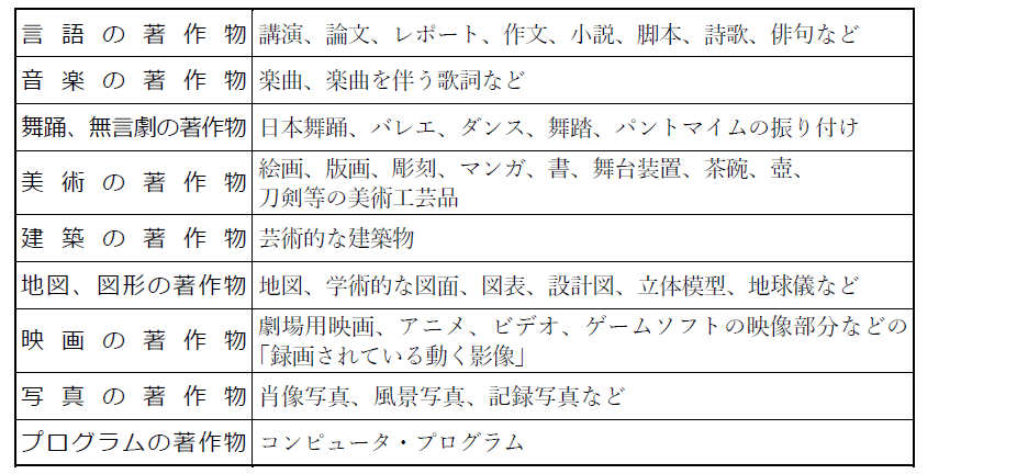 著作権の対象となる著作物は、「思想又は感情を創作的に表現したものであって、文芸、学術、美術又は音楽の範囲に属するもの」と定義されており、具体的には以下のようなものが挙げられます。