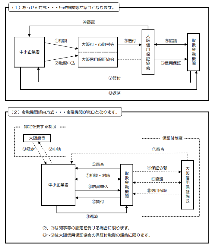 この融資においては、地方自治体が窓口となる方式(あっせん方式)と、金融機関が窓口となる方式があります。大阪府の場合の流れは、下図のとおりです。